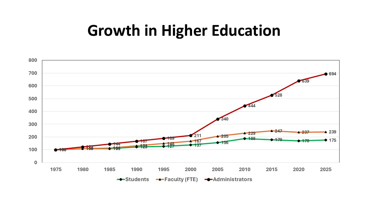 The data exhibited in the chart below is sourced from the Integrated Postsecondary Education Data System (IPEDS) at the National Center for Education Statistics (NCES). They collect data for the student fall enrollment and faculty headcount (used as a proxy for FTE, as historical FTE-specific data follows similar trends with adjustments for part-time faculty). For administrators (including executive and professional staff). To show comparative growth, the values are normalized to 1975 = 100.